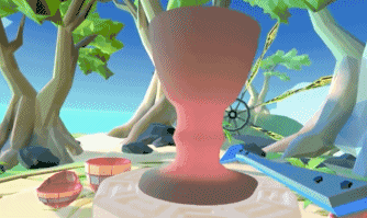 使用控制器把机械臂伸出去,转动控制器将物体举起。用触摸板来控制雕像的远近。